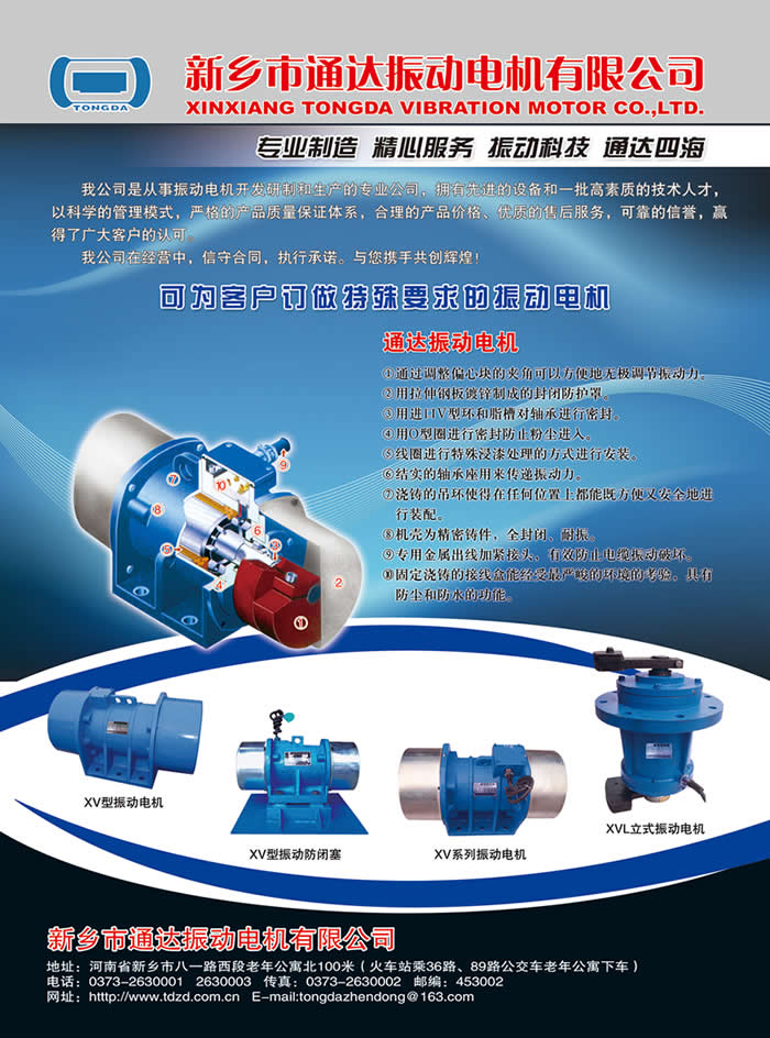 新鄉(xiāng)市通達(dá)振動電機(jī)有限公司是振動電機(jī)、立式振動電機(jī)、料倉振動防閉塞裝置、振動機(jī)械(直線篩、旋振篩、光飾機(jī)、給料機(jī)、輸送機(jī)、落沙機(jī)、烘干設(shè)備等)的專業(yè)生產(chǎn)廠家,擁有先進(jìn)的生產(chǎn)加工設(shè)備和雄厚的技術(shù)力量,確保產(chǎn)品質(zhì)量的優(yōu)越性。生產(chǎn)的各種型號振動電機(jī)、振動設(shè)備深受廣大用戶好評。通用型振動電機(jī)廣泛應(yīng)用于電力、建材、煤礦、冶金、化工、輕工、橡塑、鑄造、制藥、糧食、環(huán)保等行業(yè)。我公司愿以一流的產(chǎn)品質(zhì)量 、合理的市場價位、誠信完善的售后服務(wù)與您合作,攜手共創(chuàng)輝煌。我單位備有產(chǎn)品樣本資料,或登陸:www.xxtdzd.com公司網(wǎng)站查詢,恭候您的光臨。 |